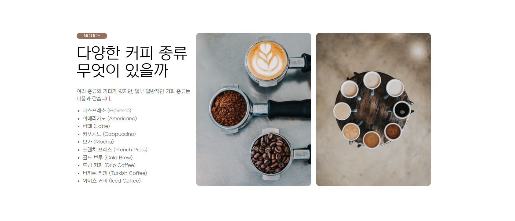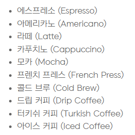 <p class="desc">여러 종류의 커피가 있지만, 일부 일반적인 커피 종류는 다음과 같습니다.</p>